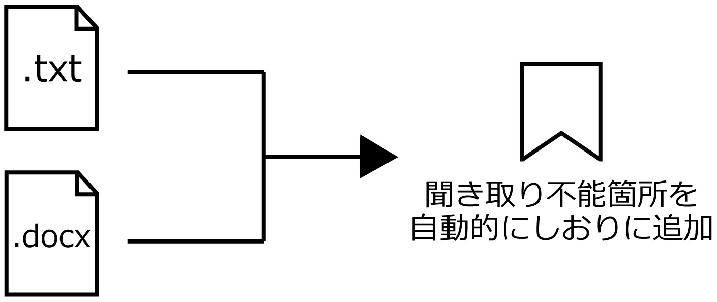 | 任意の箇所にブックマークを設定し、その位置にボタン一つでジャンプすることができます。一回で聞き取れなかった箇所を再度聞き直す場合等に便利です。 | 〇秒戻す、〇分戻す、〇秒進む、〇分進むというボタンを多数配置しています。任意の秒数・分数の設定が可能です。 | TXTファイル、Wordファイルを読み込み、不明箇所を自動的にしおりに追加することができます。聞き直し、検品時にとても便利です。 |