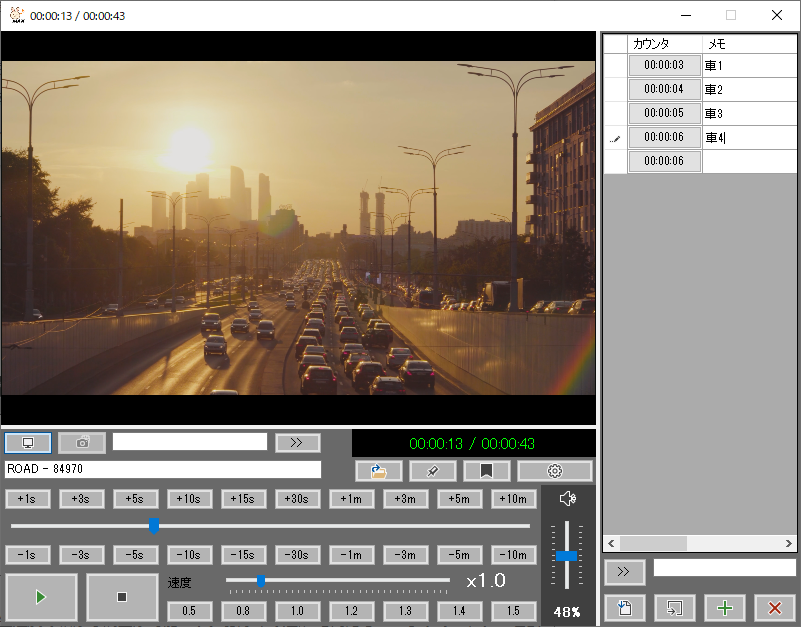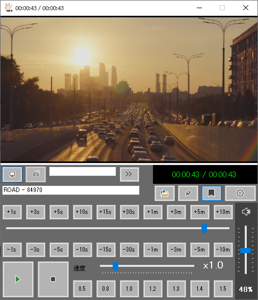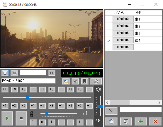 | 一時停止後、指定した秒数(0.1秒単位)を自動で巻き戻します。文字起こし支援ソフトには必須の機能です。 | 0.1倍単位での再生速度の細かな調整が可能です。お好みの速度で聞き取りを行うことができます。 | 音声データだけではなく動画データにも対応していますので、テレビ会議等の文字起こしも容易に行うことが可能です。 |