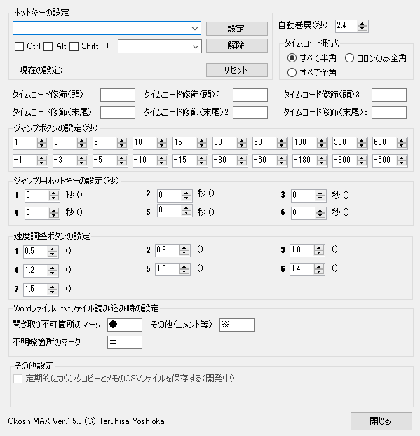 OkoshiMAXは、文字起こし・テープ起こし・議事録等の作成ならびにその検品用につくられたフリーソフトです。ウィンドウの切り替えを行うことなくキーボードショートカット(ホットキー)による音声・動画の再生/停止/巻き戻し/早送り/カウンタコピーなどをすることができます。0.1秒単位での自動巻き戻し機能、任意の秒数・分数を設定可能なジャンプボタンなど、かなり細かな設定をすることも可能です。ワープロソフトやテキストエディタを最前面で操作しながらプレーヤーの操作を行うことができるため、起こし作業の効率が格段に向上します。一般的な音声ファイル、動画ファイルの再生に対応しています(ffdshow等をインストールすることで、現在再生できないファイルも再生できるようになる可能性があります。お試しください)。また、フットペダルを使用することで、さらに効率的に作業を行うことが可能です。